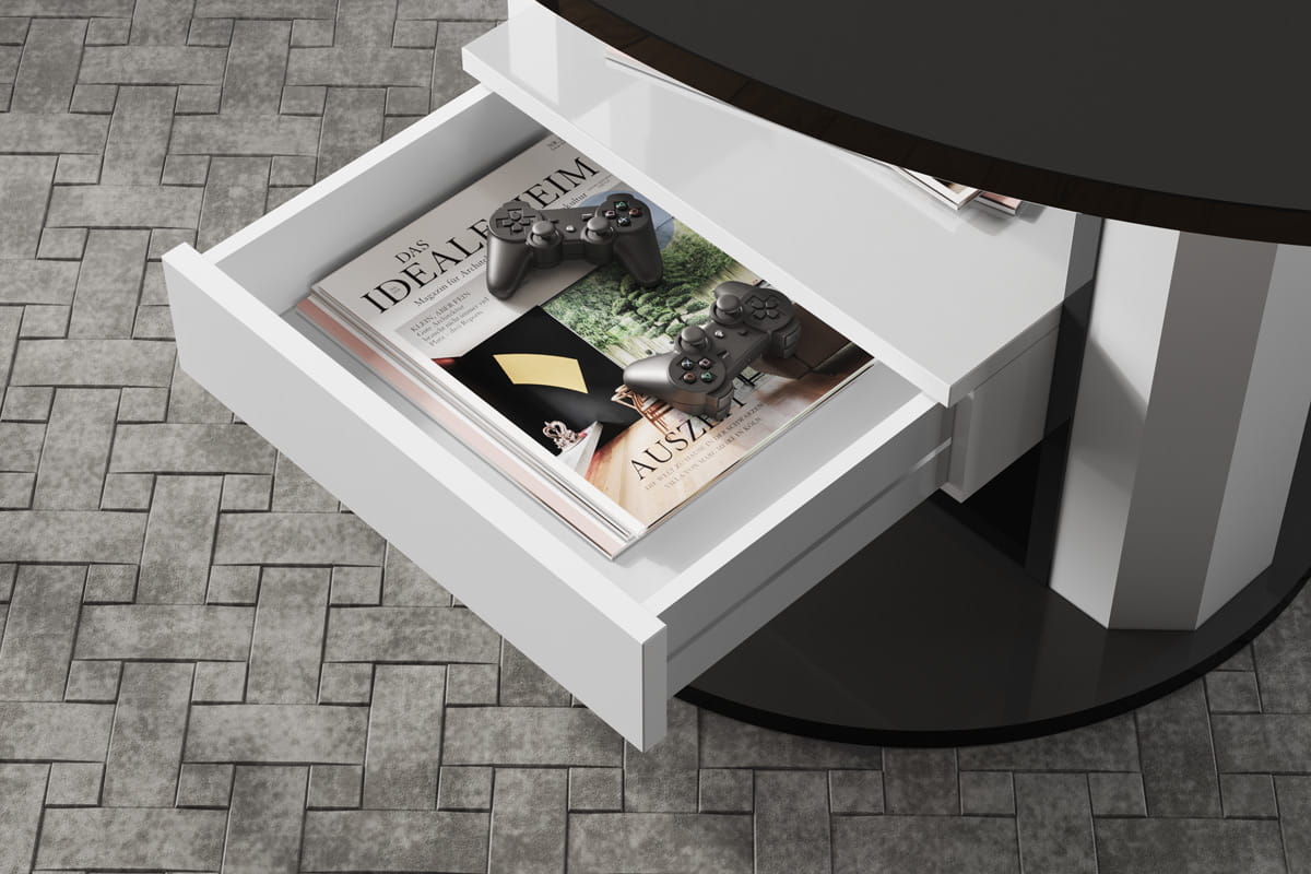 Charakterystyczną cechą modelu LIVIANO są dwie nogi w kształcie ośmiokątnych kolumn, wykończone w eleganckim połysku, które nadają meblowi wyjątkowego charakteru i zapewniają stabilność. Dodatkowo mebel został wyposażony w praktyczną szufladę oraz półkę, które oferują dodatkową przestrzeń do przechowywania drobnych akcesoriów.